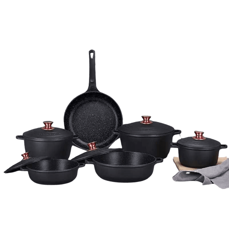 Elevate your cooking experience with the HausRoland Germany Design Cast Iron Cookware Set. Crafted with precision and elegance, this collection features durable, non-stick cast iron pots and pans with sleek black finish and stylish gold knobs. Ideal for slow cooking, roasting, frying, and more, these versatile pieces combine traditional German craftsmanship with modern aesthetics. Whether preparing a family meal or hosting guests, this cookware set adds both functionality and sophistication to your kitchen.