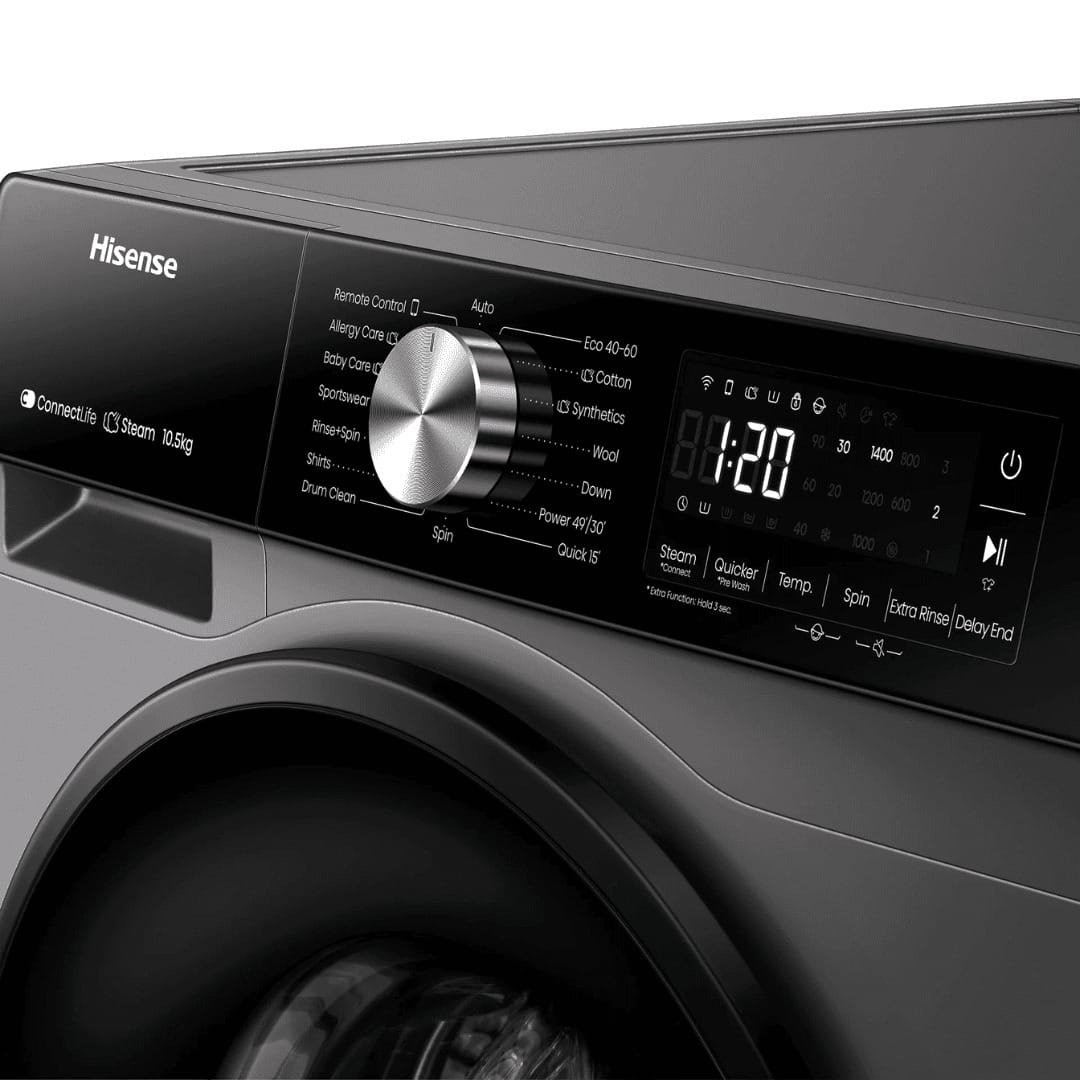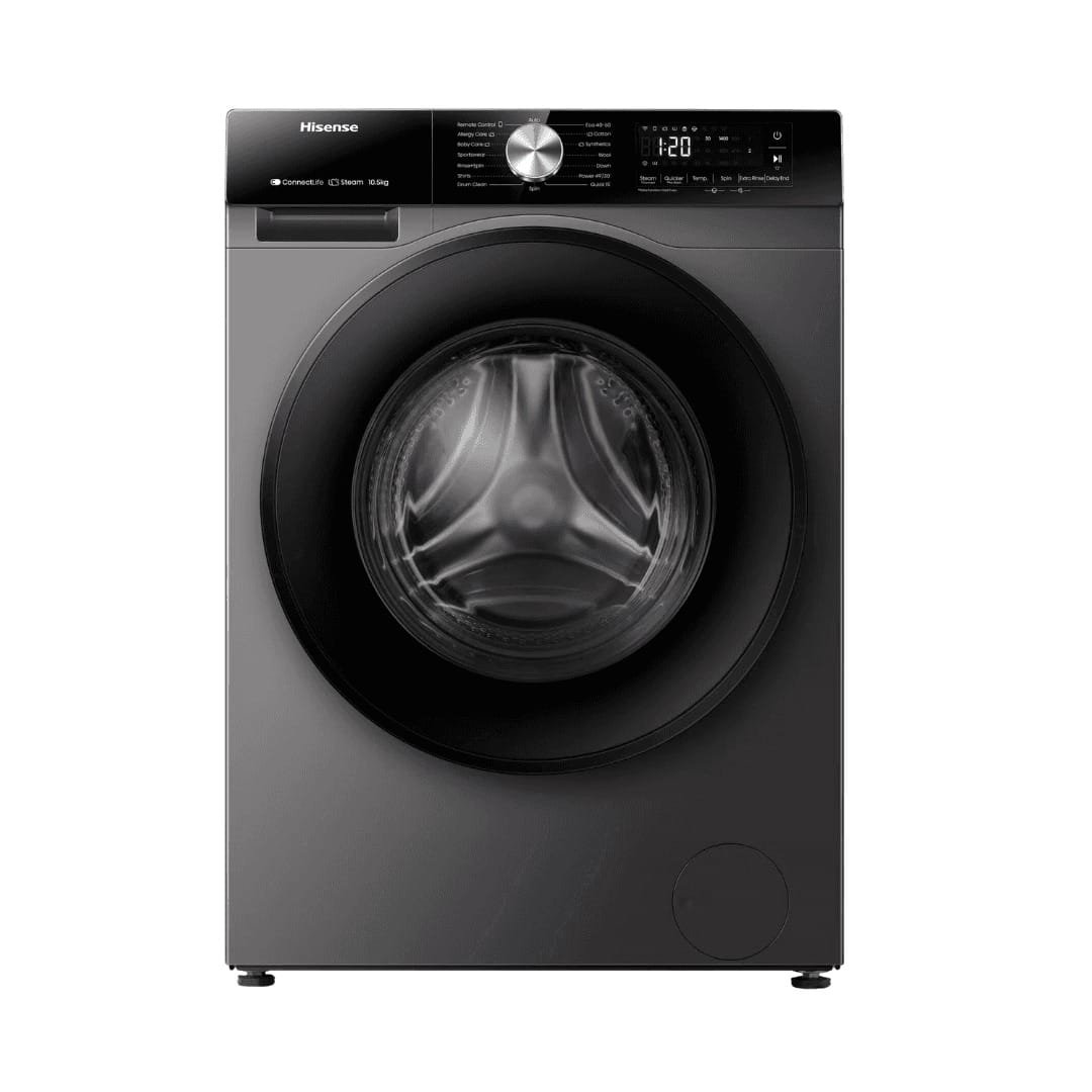 The Hisense 10.5KG Front Load Washing Machine is designed for large households that demand high performance and reliability. With a massive 10.5KG capacity, inverter technology for energy efficiency, and smart control for convenience, it ensures powerful cleaning with reduced consumption. Its modern gray finish and robust build make it a stylish, durable, and dependable addition to your home.