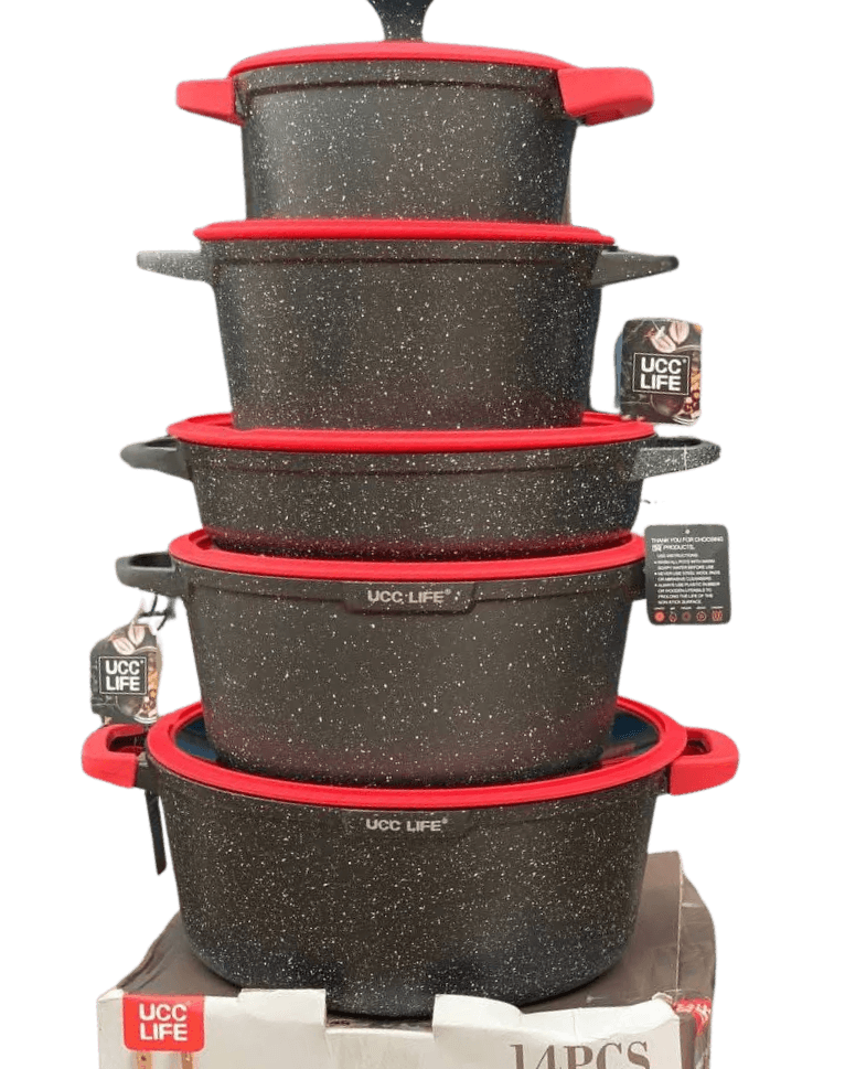 Elevate your cooking with the UCC LIFE Granite Coating 4-Piece Kitchen Cookware Set. Crafted with a durable granite non-stick surface, these pots and pans offer even heat distribution and effortless food release. Featuring a stylish black finish with red accents on the lids and handles, this set combines functionality with modern aesthetics. Ideal for everyday cooking, it’s designed to make meal preparation simple, safe, and enjoyable.